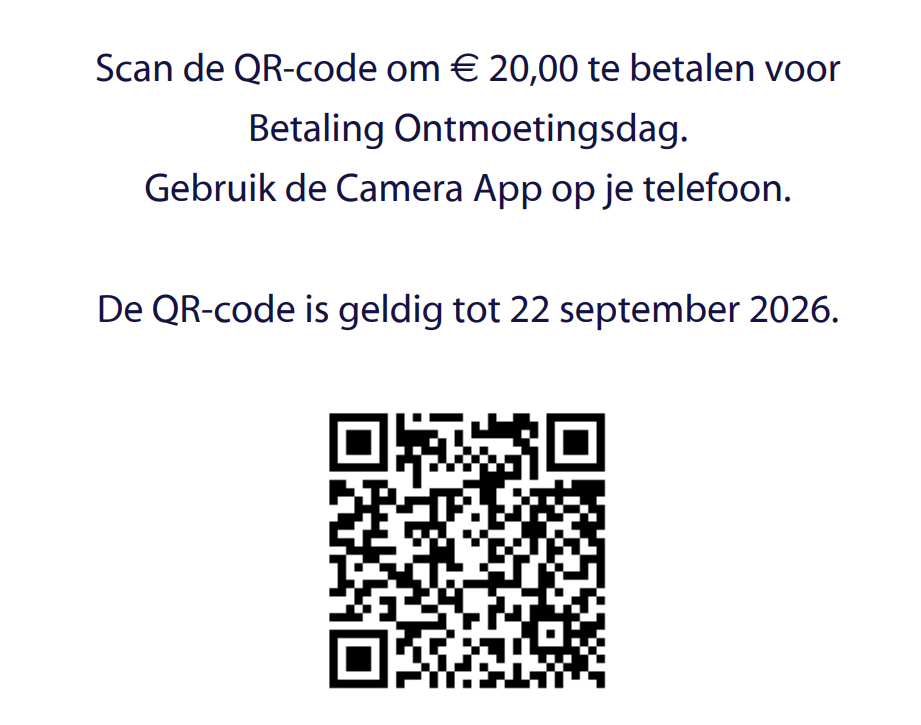 Je inschrijving is geldig als je de bijdrage van 20 € betaald hebt. Dit kun je doen met de QR code op deze pagina: